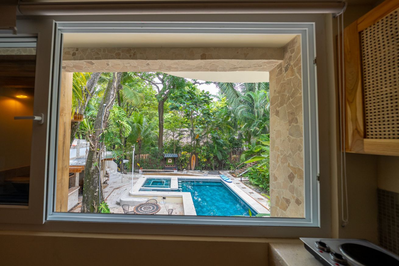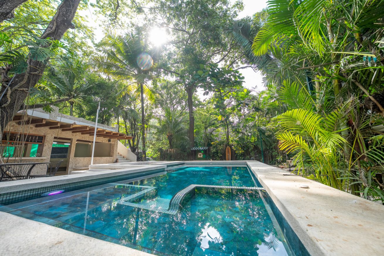 La villa está rodeada de exuberante selva tropical que sorprende apenas entras. Monos, ardillas, iguanas, pizotes, aves y mariposas visitan con frecuencia. Lo especial: aunque estamos en el centro de Santa Teresa, la villa es un oasis oculto, un lugar que no se ve desde afuera. Aquí, la naturaleza no adorna: manda.